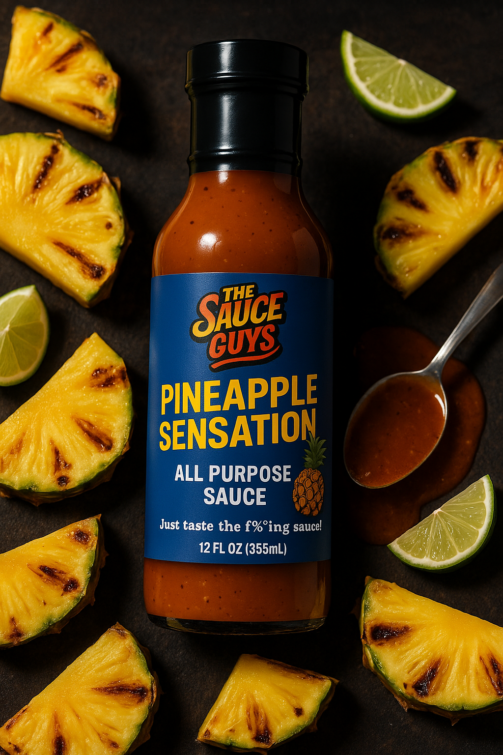The Sauce Guys started in a Navy galley, traveling to Portugal, Bahrain, Greece, and Dubai. The mission: a sauce for everyone. After countless iterations and 23 handpicked ingredients, Pineapple Sensation was born—a sweet heat sauce with tropical pineapple, tangy citrus, and the perfect kick. Versatile for any dish, balanced for any palate.